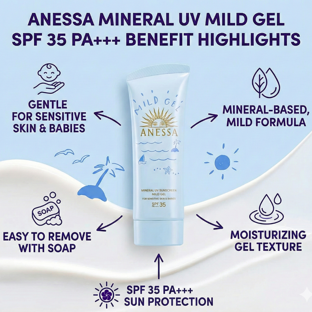 Discover the perfect sunscreen for sensitive skin and beauty lovers alike! The Anessa Mineral UV Mild Gel combines powerful UV protection with a lightweight, skin-loving formula. Designed for both adults and children (6 months+), this sunscreen is your go-to for everyday sun care.